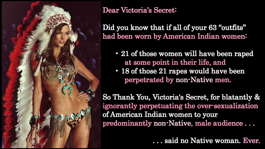 Συν το ότι πρόκειται για εσώρουχα, που φοράει μια ημίγυμνη γυναίκα που δεν είναι ιθαγενής για να τα προωθήσει. Και αντικειμενοποίηση που τρέφει γι’ ακόμα μια φορά το στερεότυπο της «εξωτικής Ινδιάνας» λοιπόν και εκμετάλλευση των στερεοτύπων για τους ιθαγενείς της Αμερικής (οι οποίοι μάλλον δεν θα βγάλουν δεκάρα από τις πωλήσεις της Victoria’s Secret).
