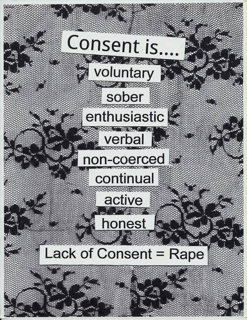 Η συναίνεση είναι: εθελοντική, νηφάλια, ενθουσιώδης, λεκτική, μη-εξαναγκασμένη, συνεχόμενη, ενεργής, ειλικρινής. Απουσία συναίνεσης = Βιασμός.
