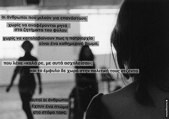Εμείς ας προσπαθούμε όπως μπορούμε προκειμένου σεξιστ@, τρανσφοβικ@, ομοφοβικ@, βιαστ@ να μη νιώθουν άνετα να δρουν και να υπάρχουν μέσα στα α/α/α κινήματα. Για τη δική μας ουτοπία, όπου σεξιστικές, τρανσφοβικές, ομοφοβικές, μισογυνιστικές συμπεριφορές, αντιλήψεις, νοοτροπίες και πρακτικές δεν θα χωρούν. Κατά τον ίδιο τρόπο που δεν χωρούν ρατσιστικές, εθνικιστικές και φασιστικές συμπεριφορές, αντιλήψεις, νοοτροπίες, πρακτικές. Μέχρι την κατάλυση κάθε εξουσιαστικής δομής, συμπεριλαμβανομένων και των πατριαρχικών δομών.